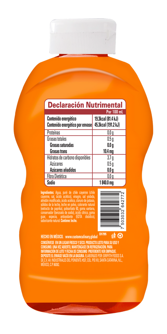 Nuestra versión de salsa para alitas, intensa, vibrante, ácida y de una textura inigualable que mantiene la salsa en las alitas y no en el plato. Basada en chile cayenne, vinagre, especias y un picor medio, esta salsa sin duda hará de tus alitas uno de los platillos más vendidos de tu menú.